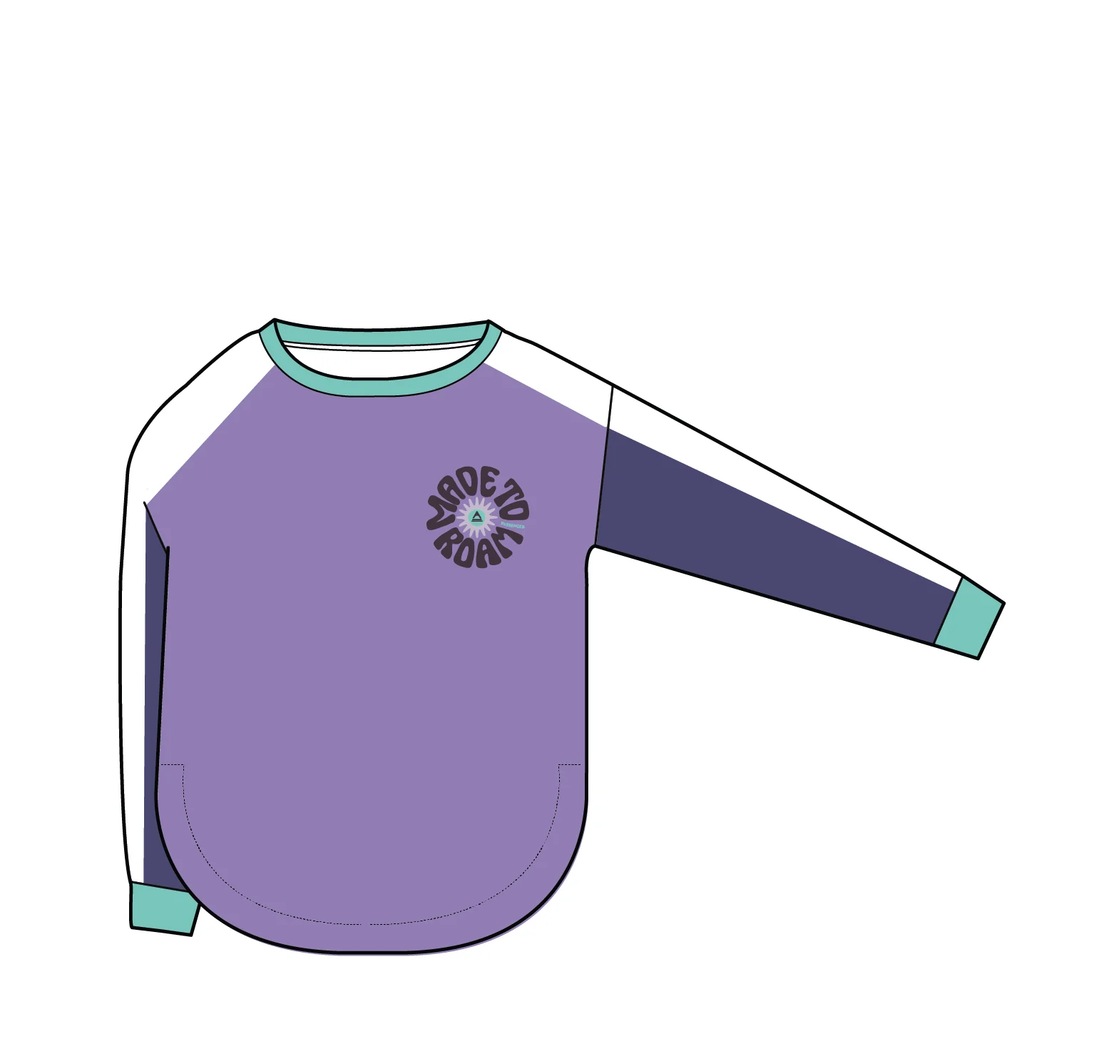 - Slouchy Long sleeve top with scooped hem and contrast panel along shoulders and sleeves.